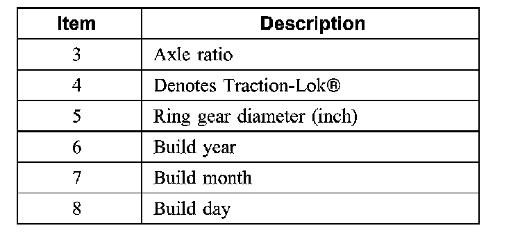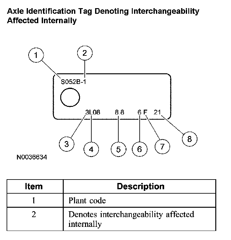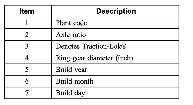 The axle identification tag identifies a particular axle design, a specific ratio, and if it is a conventional or limited slip (Traction-Lok) type. In addition, the plant code will not change as long as that particular axle assembly never undergoes an external design change. If, however, an internal design change takes place during the production life of the axle and that internal change affects parts interchangeability, a dash and numerical suffix is added to the plant code. This means that as an assembly both axles are interchangeable; however, internally they are different. Therefore, each requires different internal parts at the time of repair.
