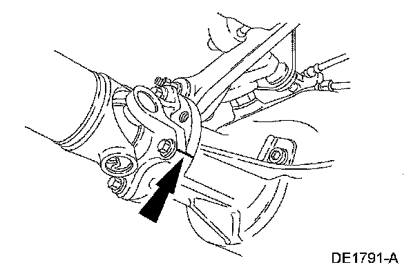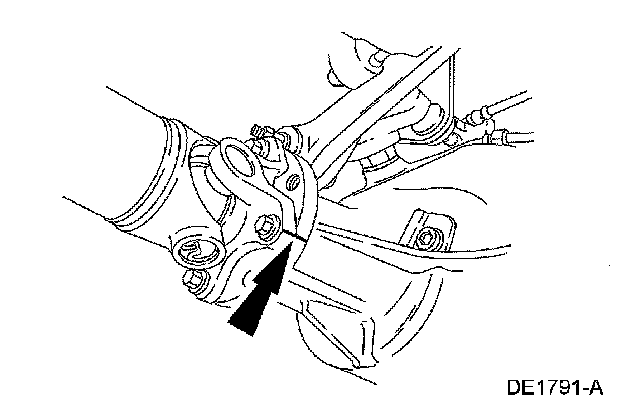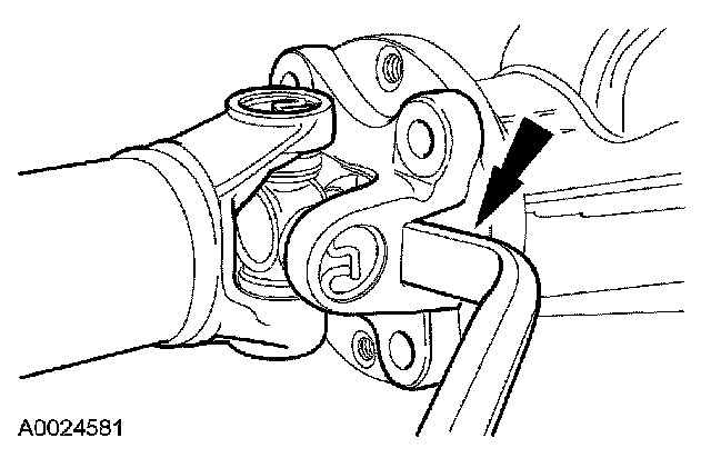 5. CAUTION: The driveshaft centering socket yoke fits tightly on the rear axle pinion flange pilot. Never hammer on the driveshaft or any of its components to disconnect the yoke from the flange. Pry only in the area shown with a suitable tool to disconnect the yoke from the flange.