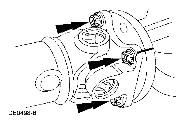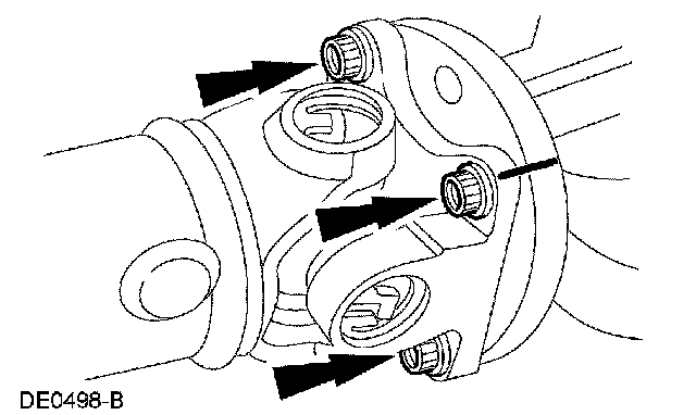 9. CAUTION: The driveshaft centering socket yoke fits tightly on the rear axle pinion flange pilot. To make sure that the yoke seats squarely on the flange, tighten the bolts evenly in a cross pattern.