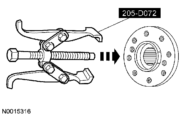 Using a suitable tool as shown, disconnect the driveshaft centering socket yoke from the rear axle pinion flange.