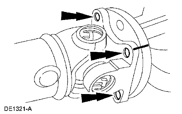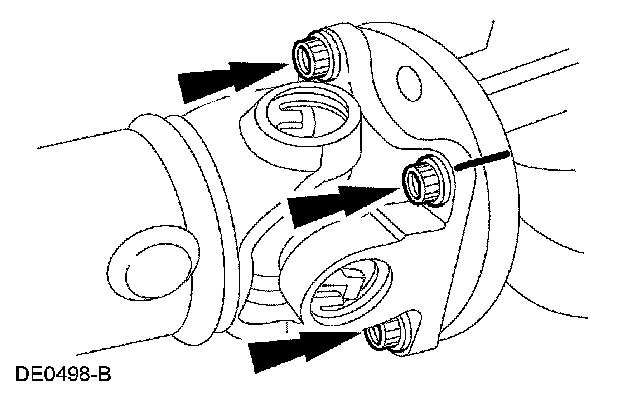 11. CAUTION: The driveshaft centering socket yoke fits tightly on the rear axle pinion flange pilot. To make sure that the yoke seats squarely on the flange, tighten the bolts evenly in a cross pattern.