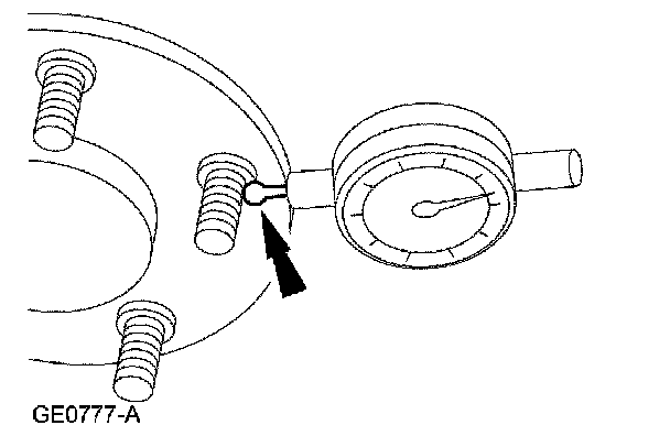 2. Rotate the hub or flange until the next bolt is contacted. Record the measurement and continue until each bolt is checked. The difference between the maximum and minimum contact readings will be the total wheel hub or axle flange bolt pattern runout. The runout must not exceed 0.38 mm (0.015 inch).