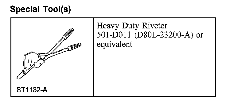 - Using the special tool, install the two spacers and two 1/4 inch rivets (use of 1/4 - 20 x 1 inch screw and washer assemblies and 1/4 inch - 20 nut and washer are optional). Tighten the nut (if used) to 13 Nm (10 lb-ft).