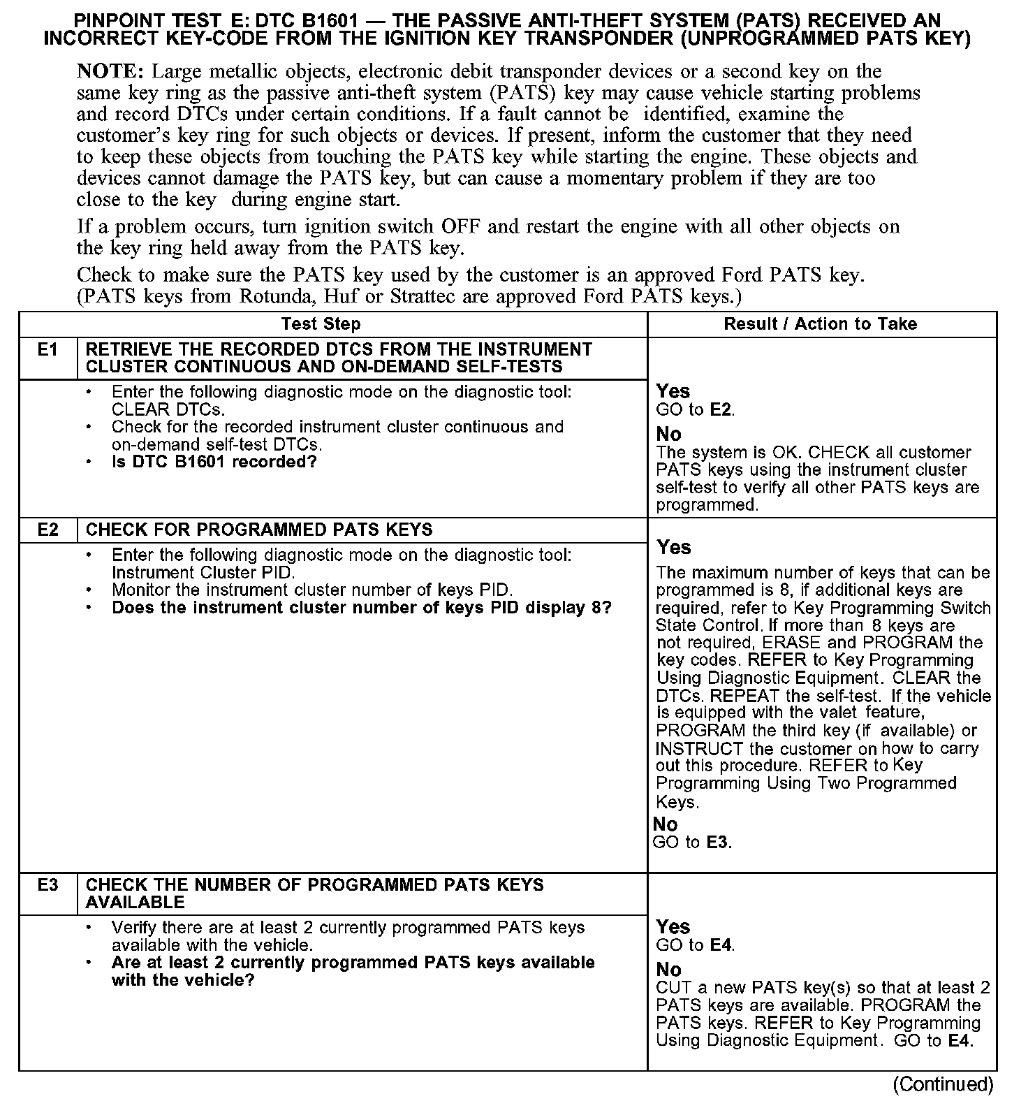 PINPOINT TEST E: DTC B1601 - THE PASSIVE ANTI-THEFT SYSTEM (PATS) RECEIVED AN INCORRECT KEY-CODE FROM THE IGNITION KEY TRANSPONDER (UNPROGRAMMED PATS KEY)E1-E3: