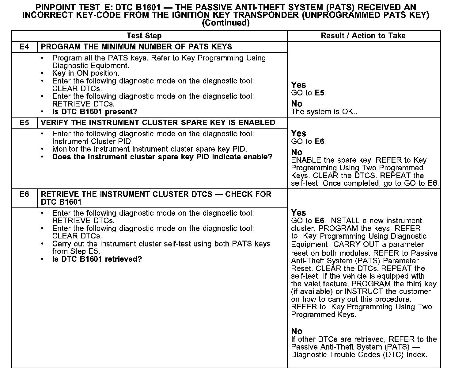 Test E: DTC B1601 - The PATS Received An Incorrect Key-Code From The Ignition Key Transponder (Unprogrammed PATS Key)