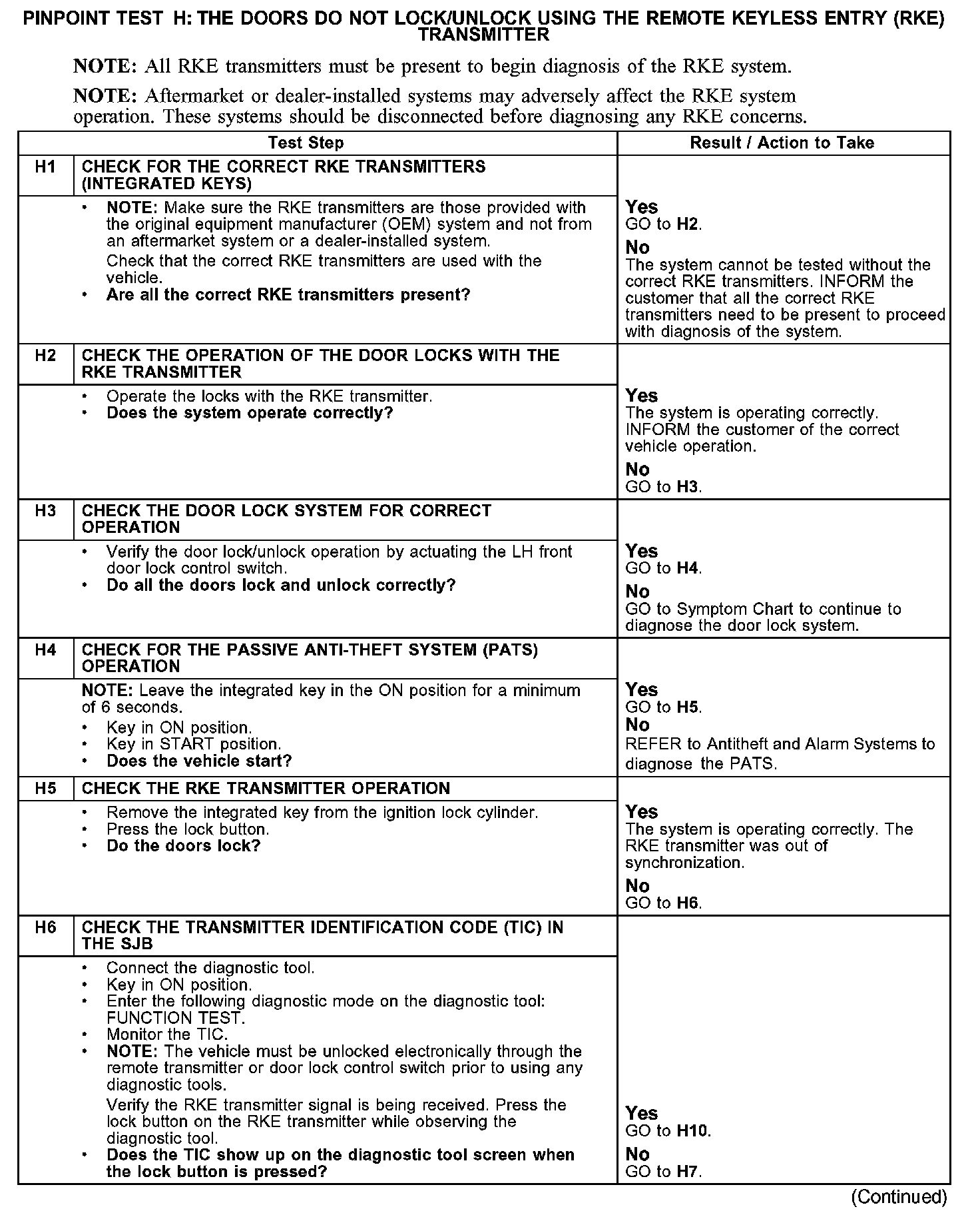 PINPOINT TEST H: THE DOORS DO NOT LOCK/UNLOCK USING THE REMOTE KEYLESS ENTRY (RKE) TRANSMITTERH1-H6: