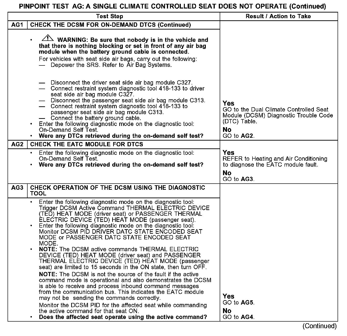 Each driver and front passenger seat cushion is equipped with a thermo-electric device (TED) assembly that includes a seat blower (fan motor, serviced as an assembly with the TED). Similarly, each driver and front passenger seat backrest is also equipped with its own TED assembly with blower. Cabin air is drawn through the blower and distributed to each of the TED modules located in the seat cushion and backrest. The TEDs then heat or cool the air. The air is then directed into the foam pad and manifold where it is distributed along the surface of the cushion and backrest of the seat. Once the system is activated, the DCSM uses a set of flexible algorithms to control the heating/cooling modes and the blower speed dependant on the EATC seat switch settings.
