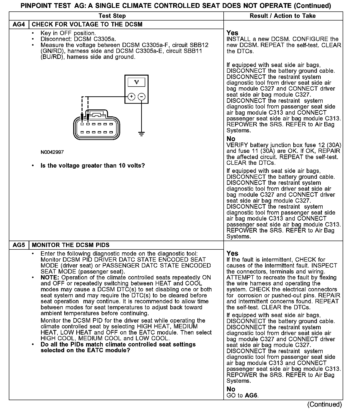 Both the driver and front passenger climate controlled seats are independently controlled electronically by the dual climate controlled seat module (DCSM) mounted to the bottom of the passenger seat cushion. The climate controlled seat system only operates with the engine running, however, if using a diagnostic tool to command the DCSM, diagnostic testing can be carried out with the ignition switch key ON engine OFF (KOEO). The system receives power from battery junction box (BJB) fuse 12 (30A) feeding battery voltage on circuit SBB12 (GN/RD) into DCSM C3305a pin F. The system also receives power from BJB fuse 11 (30A) feeding battery voltage on circuit SBB11 (BU/RD) into DCSM C3305a pin E. If power is disconnected from either pin E or F of DCSM C3305a with the power connection remaining on the other circuit, both seats will remain operational because the power feed circuits are connected internally in the DCSM. However, if a fault occurs setting a DTC specific to either climate controlled seat, only the affected seat will be disabled by the module and the other will remain operational.