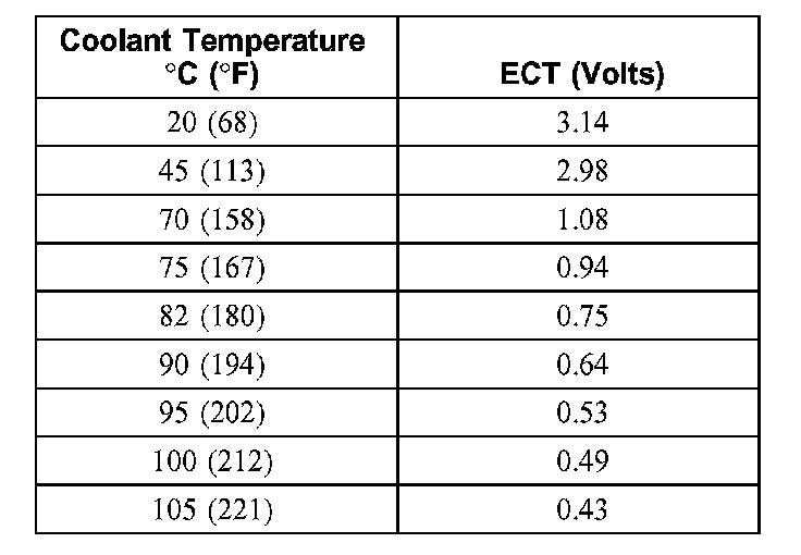 4. Start the engine and allow the engine to idle throughout this test. Allow the engine to run for 2 minutes, then record the ECT voltage. Record the ECT voltage every 60 seconds. When the ECT voltage trend changes direction or only changes slightly (0.03 volt or less) from the previous reading, record this as the thermostat opening voltage. Use the voltage and corresponding coolant temperature chart.