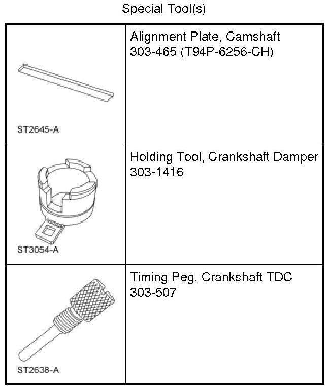 NOTICE: Do not loosen or remove the crankshaft pulley bolt without first installing the special tools as instructed in this procedure. The crankshaft pulley and the crankshaft timing sprocket are not keyed to the crankshaft. The crankshaft, the crankshaft sprocket and the pulley are fitted together by friction, using diamond washers between the flange faces on each part. For that reason, the crankshaft sprocket is also unfastened if the pulley bolt is loosened. Before any repair requiring loosening or removal of the crankshaft pulley bolt, the crankshaft and camshafts must be locked in place by the special service tools, otherwise severe engine damage can occur.