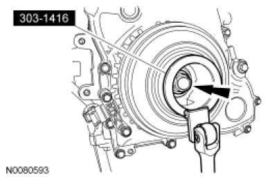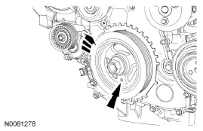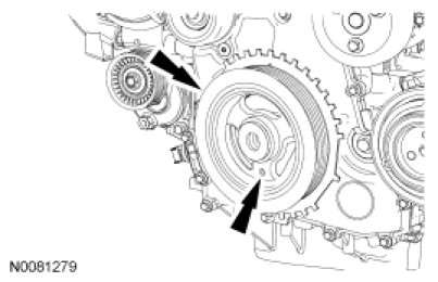 NOTICE: The crankshaft sprocket diamond washer may come off with the crankshaft pulley. The diamond washer must be replaced, remove and discard the diamond washer. If the diamond washer is not installed, engine damage may occur.