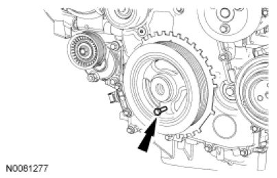 9. NOTE: The Crankshaft TDC Timing Peg will contact the crankshaft and prevent it from turning past TDC. However, the crankshaft can still be rotated in the counterclockwise direction. The crankshaft must remain at the TDC position during the crankshaft pulley removal and installation.