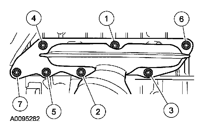 Position the catalytic converter manifold and tighten the 7 new nuts in the sequence shown, in 2 stages.