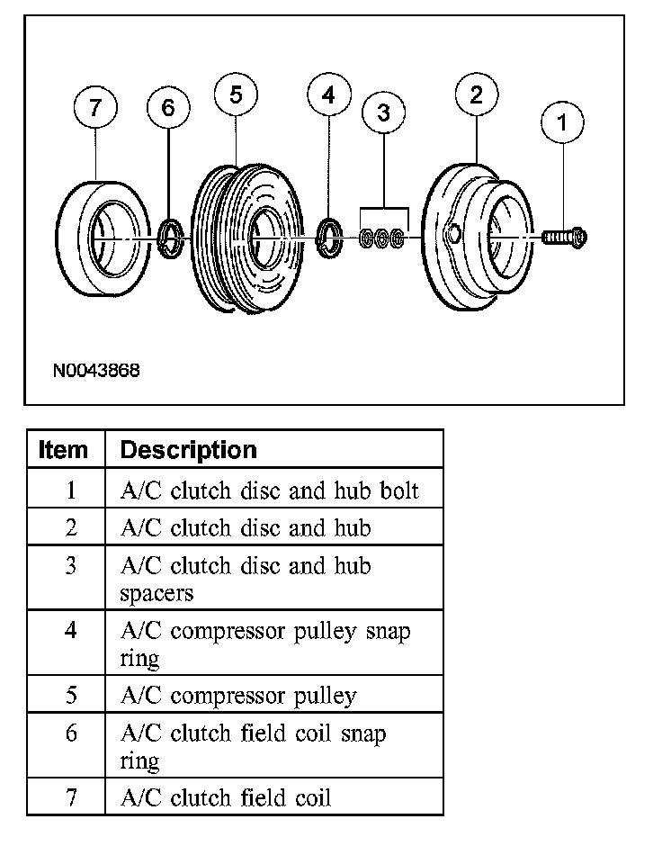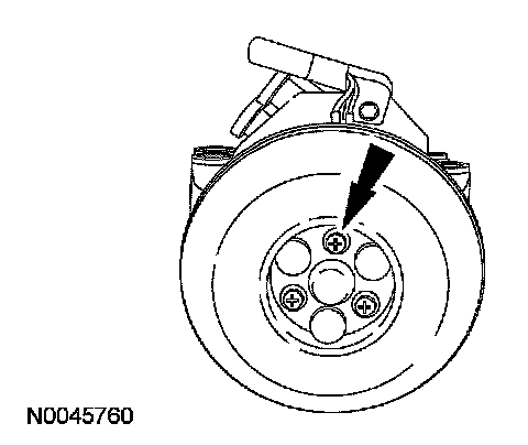 NOTE: If installing a new A/C compressor, the A/C clutch components should be reused unless obvious signs of damage are found. If excessive grooving is found, a new A/C clutch disc and hub and A/C compressor pulley must be installed together. Otherwise, each component can be installed individually where needed.