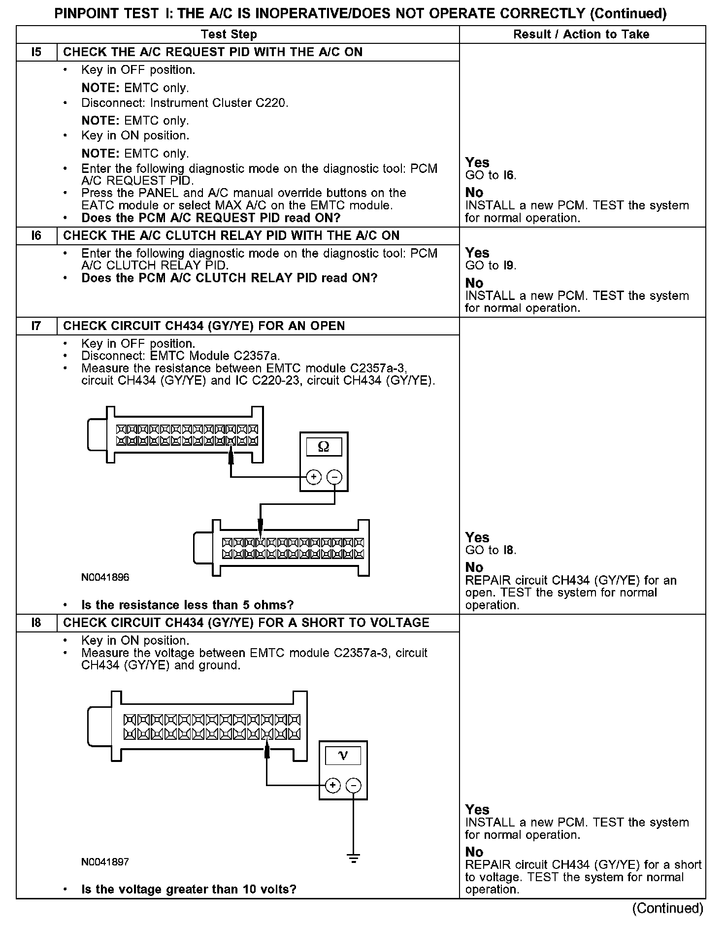 Under normal operation, when A/C is requested, a message is sent over the MSCAN bus to the instrument cluster, then from the instrument cluster through the HSCAN bus to the PCM (EATC systems); or a voltage is sent to the instrument cluster through circuit CH434 (GY/YE), then a message is sent from the instrument cluster through the HSCAN bus to the PCM (EMTC systems).