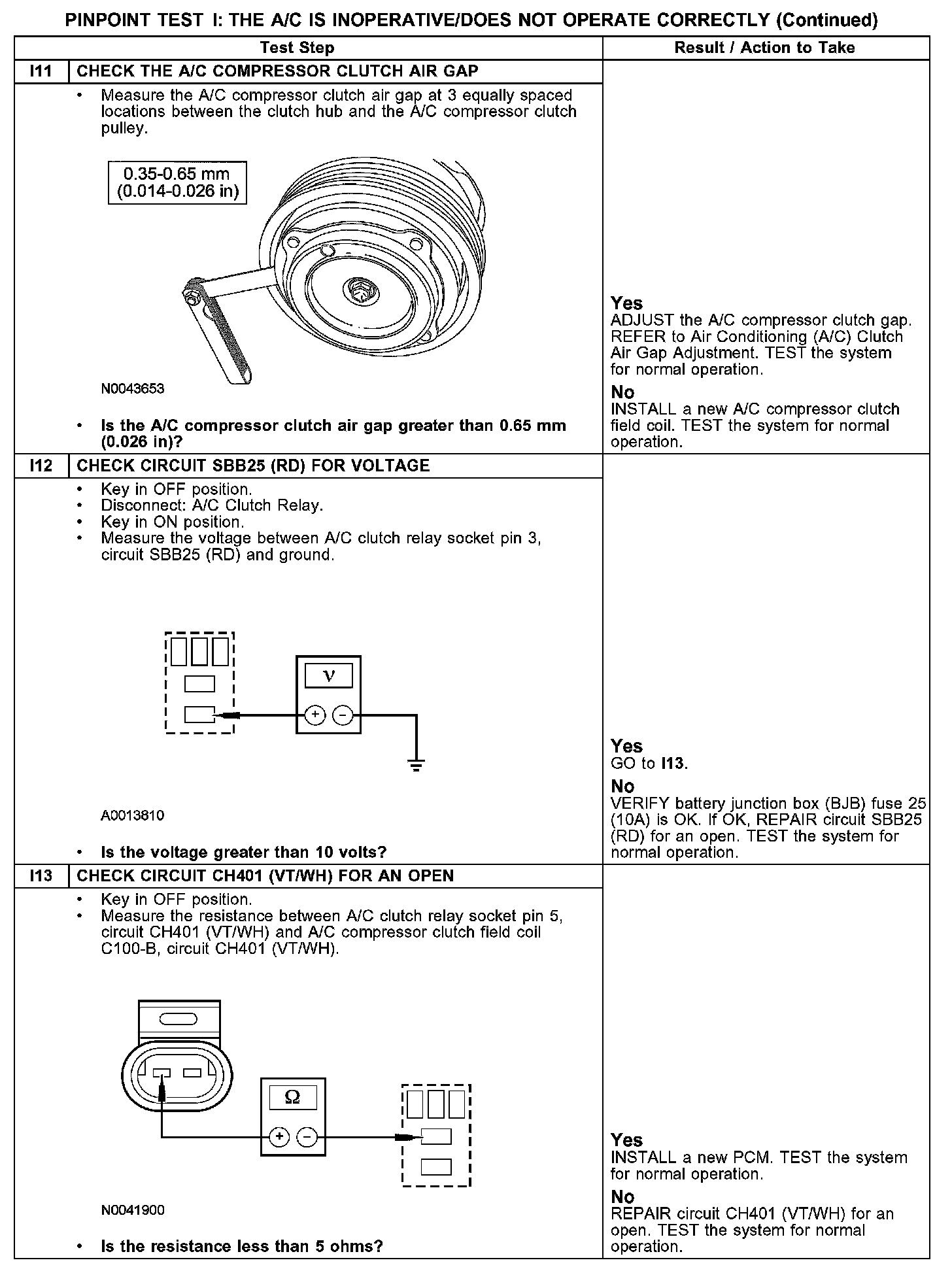 Ignition voltage for the A/C clutch relay switch is provided through circuit SBB25 (RD). When the PCM energizes the relay, ignition voltage is supplied to the A/C clutch through circuit CH401 (VT/WH). Ground is supplied for the A/C clutch through circuit GD121 (BK/YE).