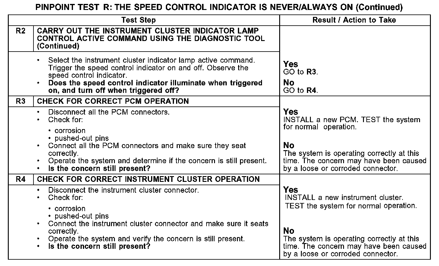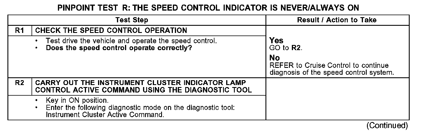 PINPOINT TEST R: THE SPEED CONTROL INDICATOR IS NEVER/ALWAYS ONR1-R2: