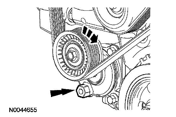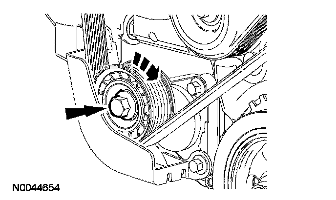 4. Using the pulley bolt, rotate the accessory drive belt tensioner clockwise and remove the accessory drive belt.