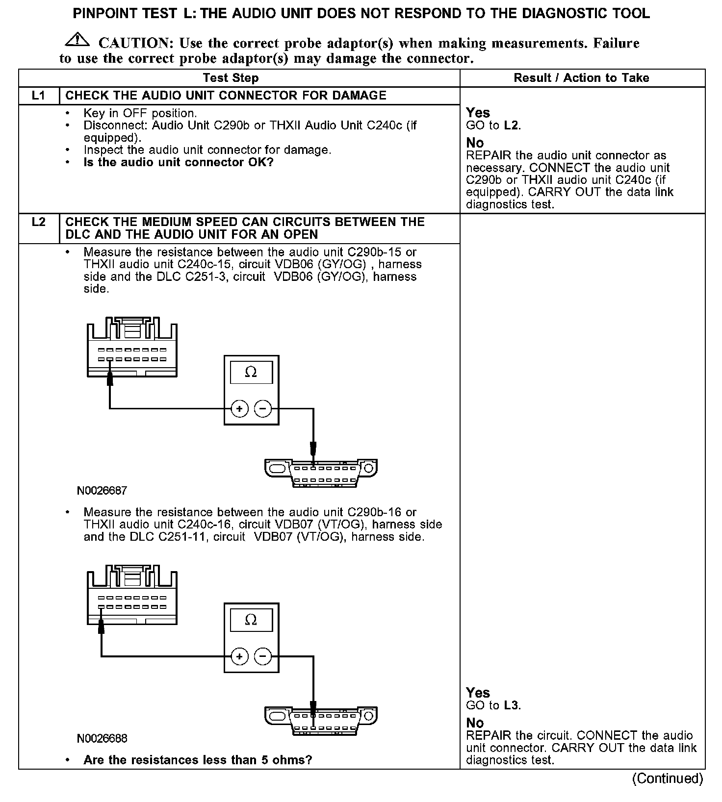 Check the medium speed CAN circuits VDB06 (GY/OG) and VDB07 (VT/OG) between the audio unit C290b or THXII audio unit C240c (if equipped) and the data link connector (DLC) C251. The total resistance values must not be more than 5 ohms. If the resistance is more than 5 ohms there is an open in one of the high speed CAN circuits, damage to the DLC C251, damage to the audio unit C290b or THXII audio unit C240c (if equipped), or a problem in an in-line connector.