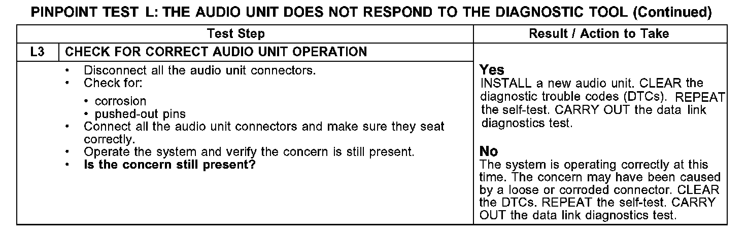 PINPOINT TEST L: THE AUDIO UNIT DOES NOT RESPOND TO THE DIAGNOSTIC TOOLL1-L2: