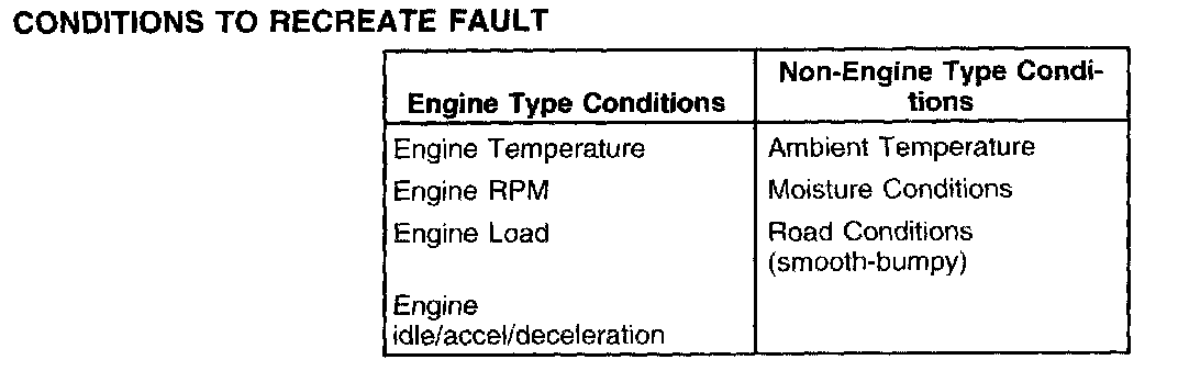 Recreating the concern is the first step in isolating the cause of the intermittent symptom. A thorough investigation should start with the customer information worksheet. If freeze frame data is available, it may help in recreating the conditions at the time of a malfunction indicator lamp diagnostic trouble code (MIL DTC). Listed are some of the conditions for recreating the concern.