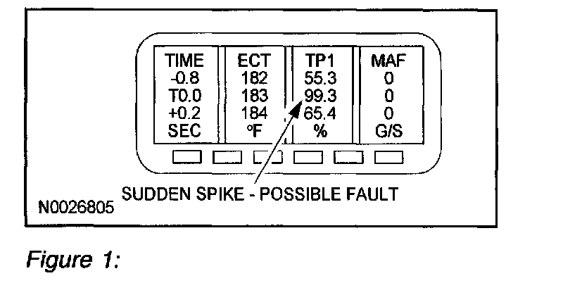 (Figure 1): Scroll through the PID data while analyzing the information. Look for sudden drops or spikes in the values. (Refer to the TP1 example). Notice the major jump in the TP1 voltage while scrolling through the information. This example would require a smooth and progressive accelerator pedal travel during a key on and engine off mode.