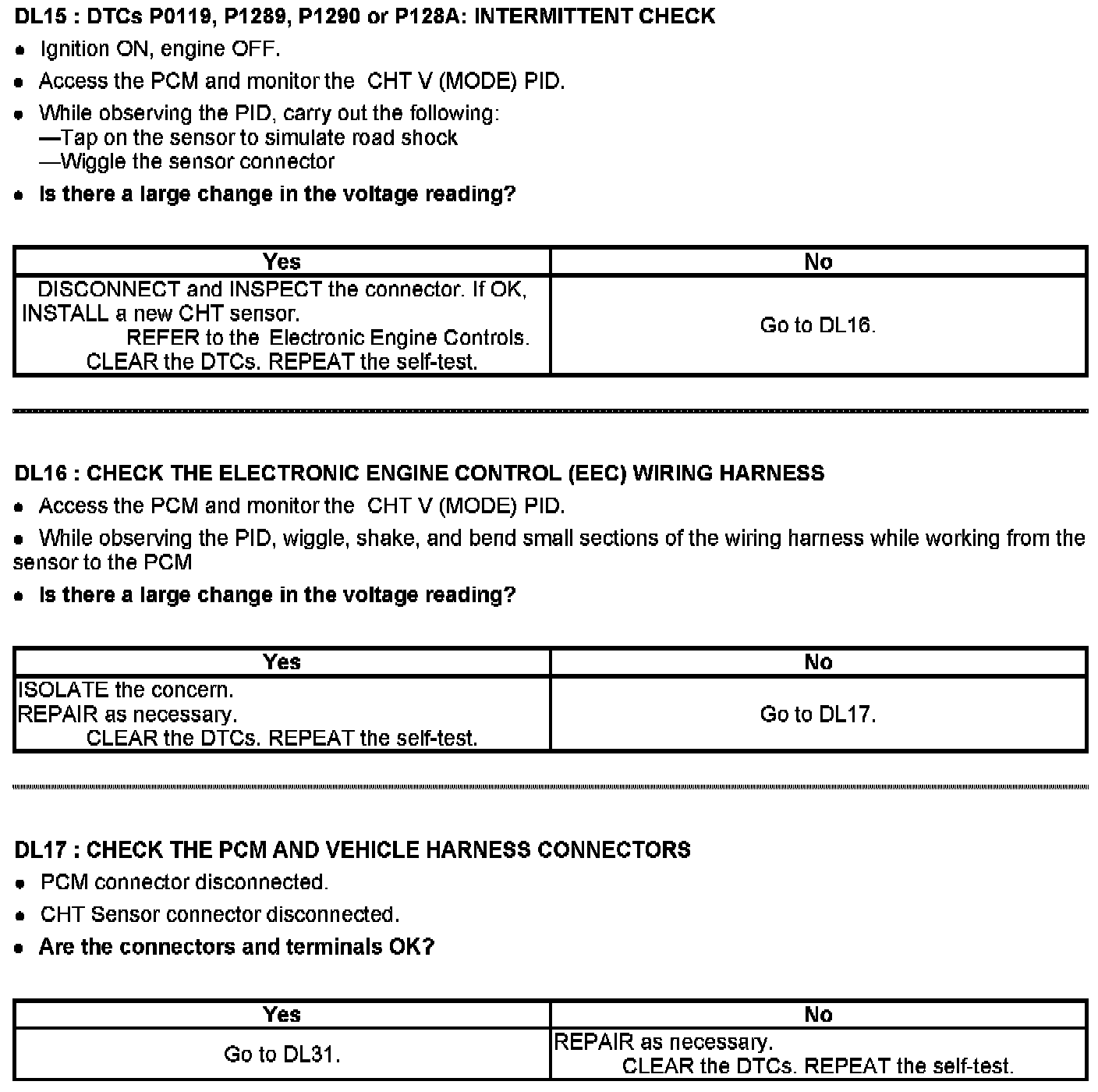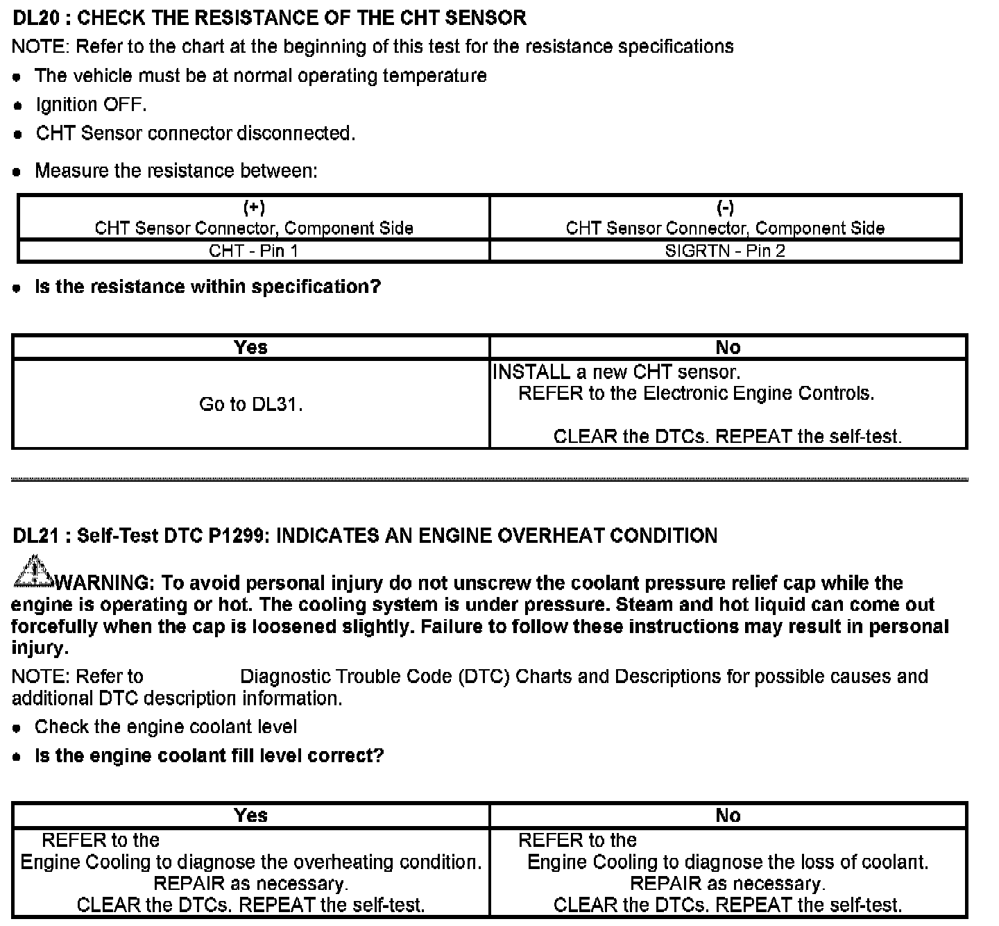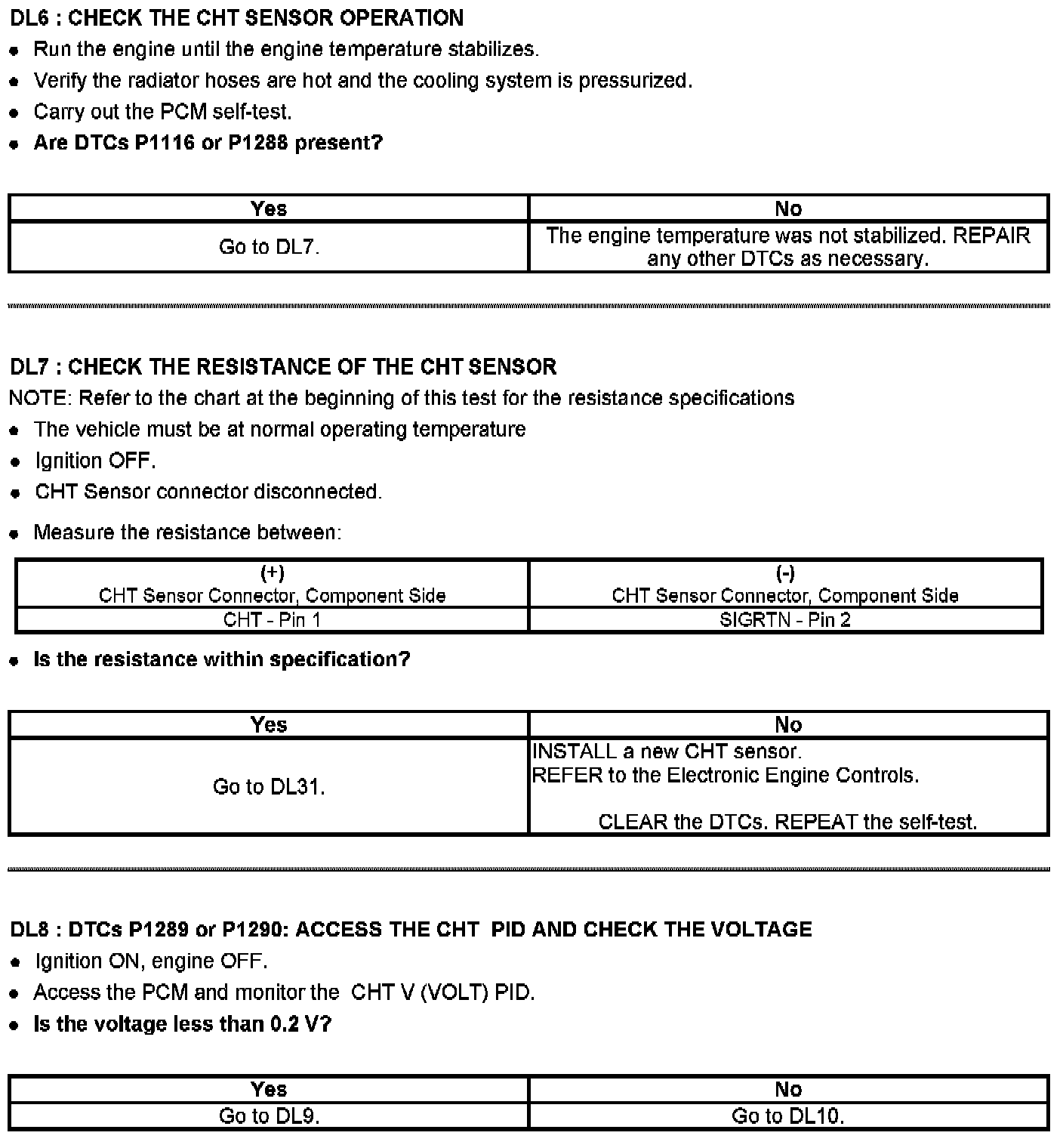 On applications that do not use an ECT sensor the CHT sensor is used to determine the engine coolant temperature. To cover the entire temperature range of both the CHT and ECT sensors the PCM has a dual switching resistor circuit on the CHT input. A graph showing the temperature switching from the COLD END line to the HOT END line with increasing temperature and back with decreasing temperature is included. Note the temperature to voltage overlap zone. Within this zone it is possible to have either a COLD END or HOT END voltage at the same temperature. For example at 90°C (194°F) the voltage could read either 0.60 volt or 3.71 volts. Refer to the table for the temperature to voltage expected values.