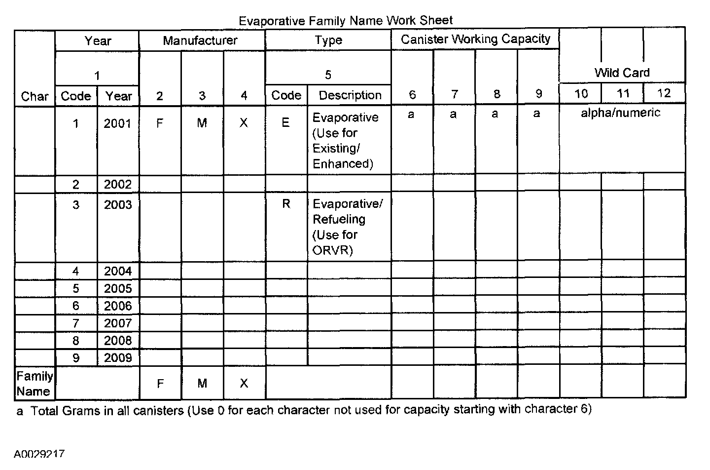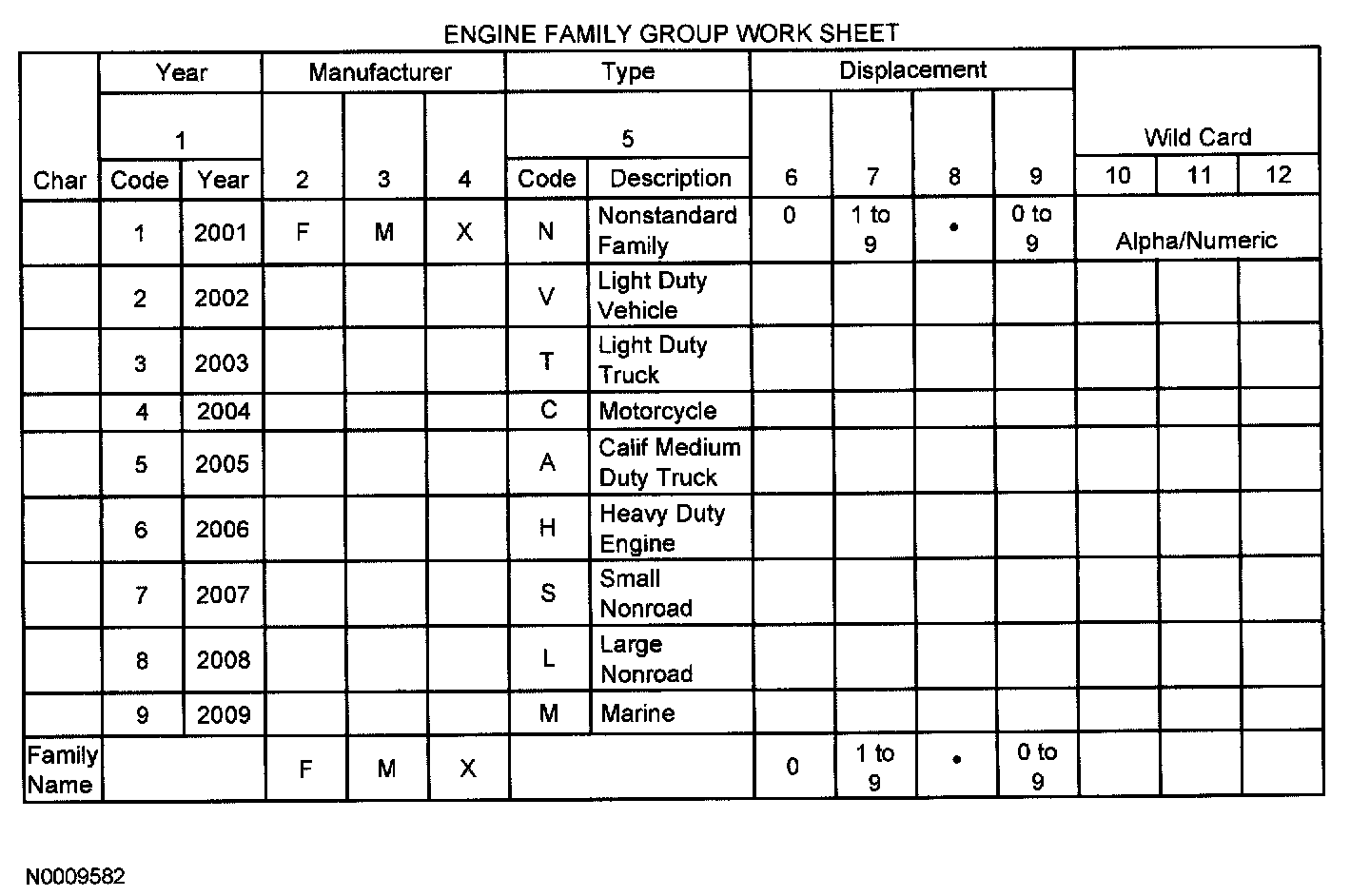 Both the engine family group and the evaporative family name are listed in the box on the emission decal as indicated in the area marked as engine evaporative family information. The first line contains engine size and the 12-character engine family group. The second line contains the 12-character evaporative family name information. Both the engine family group and the evaporative family name are specific to the vehicle. Please refer to the Engine Family Group and the Evaporative Family Name worksheet for decoding information.