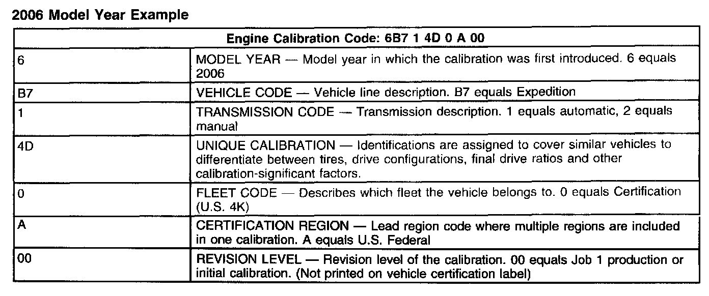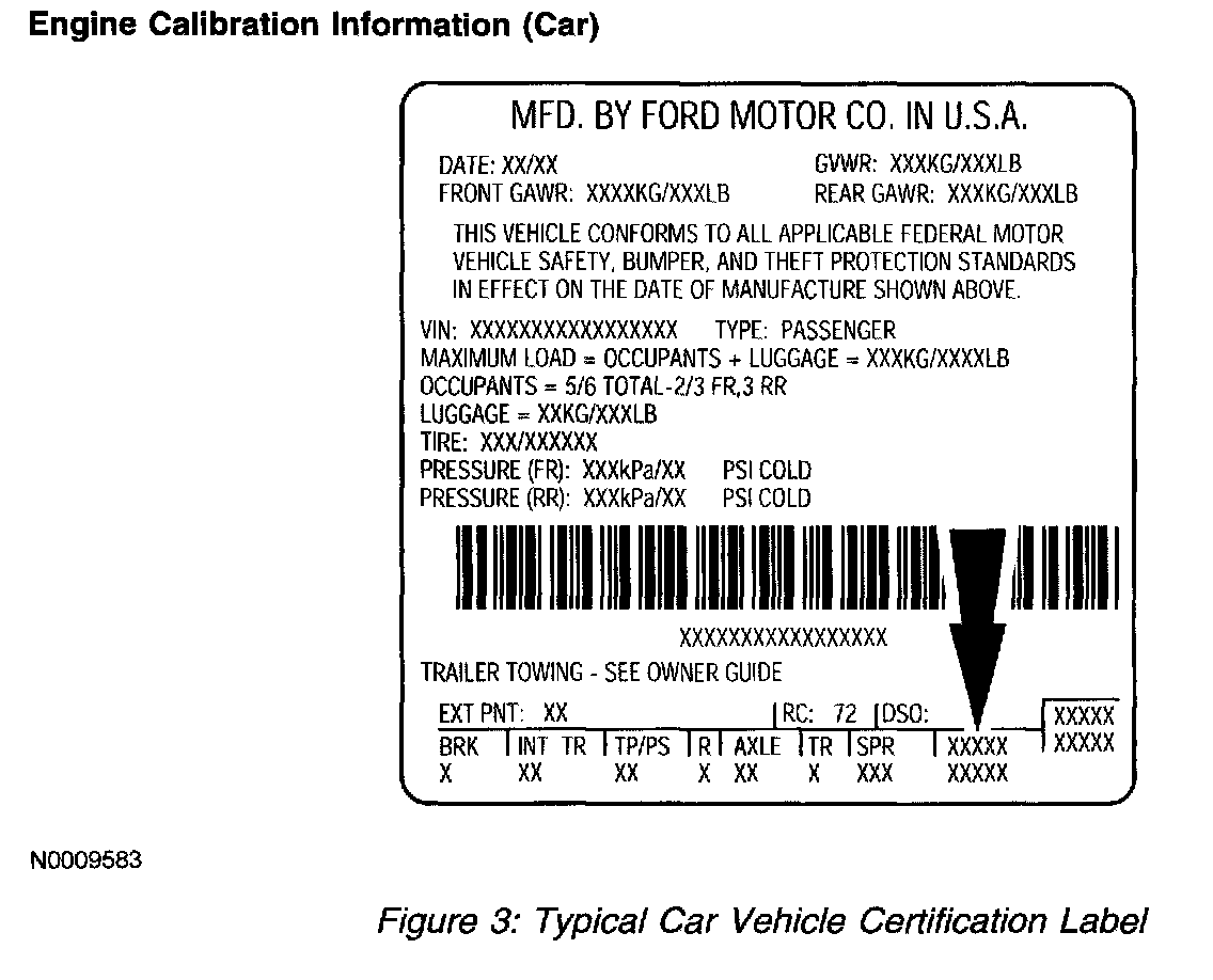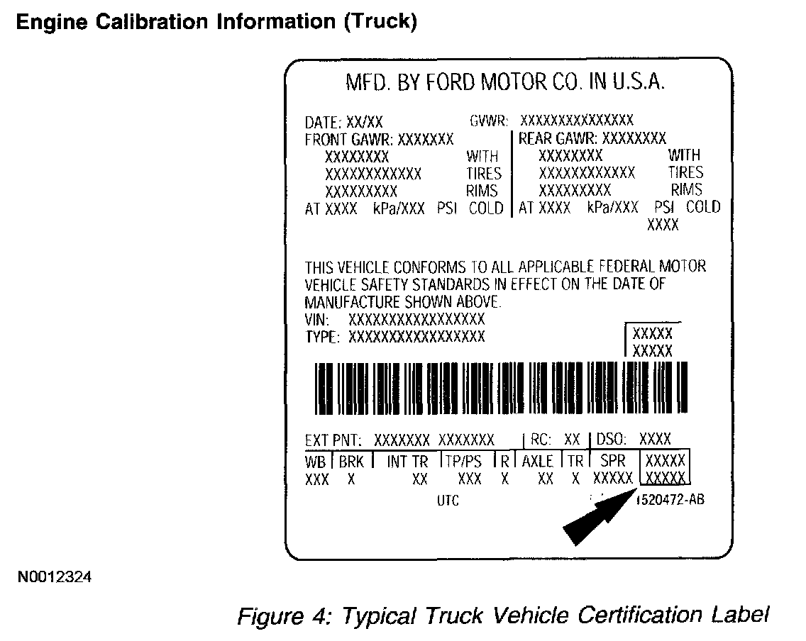 Base engine calibration information, also sometimes referred to as the powertrain calibration, is located in the lower right corner of the vehicle certification label. Engine calibration information is limited to a maximum of 5 characters per line (2 lines maximum). Calibration information more than 5 characters long wrap to the second line of this field. Only the base calibration appears on this label. The revision level is no longer printed on the label, however, it can be found in the On-Line Automotive Service Information System (OASIS). For more information on the vehicle certification label or engine calibration, refer to Vehicle/Application and ID, Identification Codes.