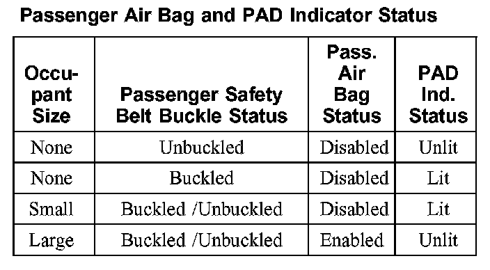 The table indicates the passenger air bag status and the PAD indicator status based the size of the front outboard passenger occupant.