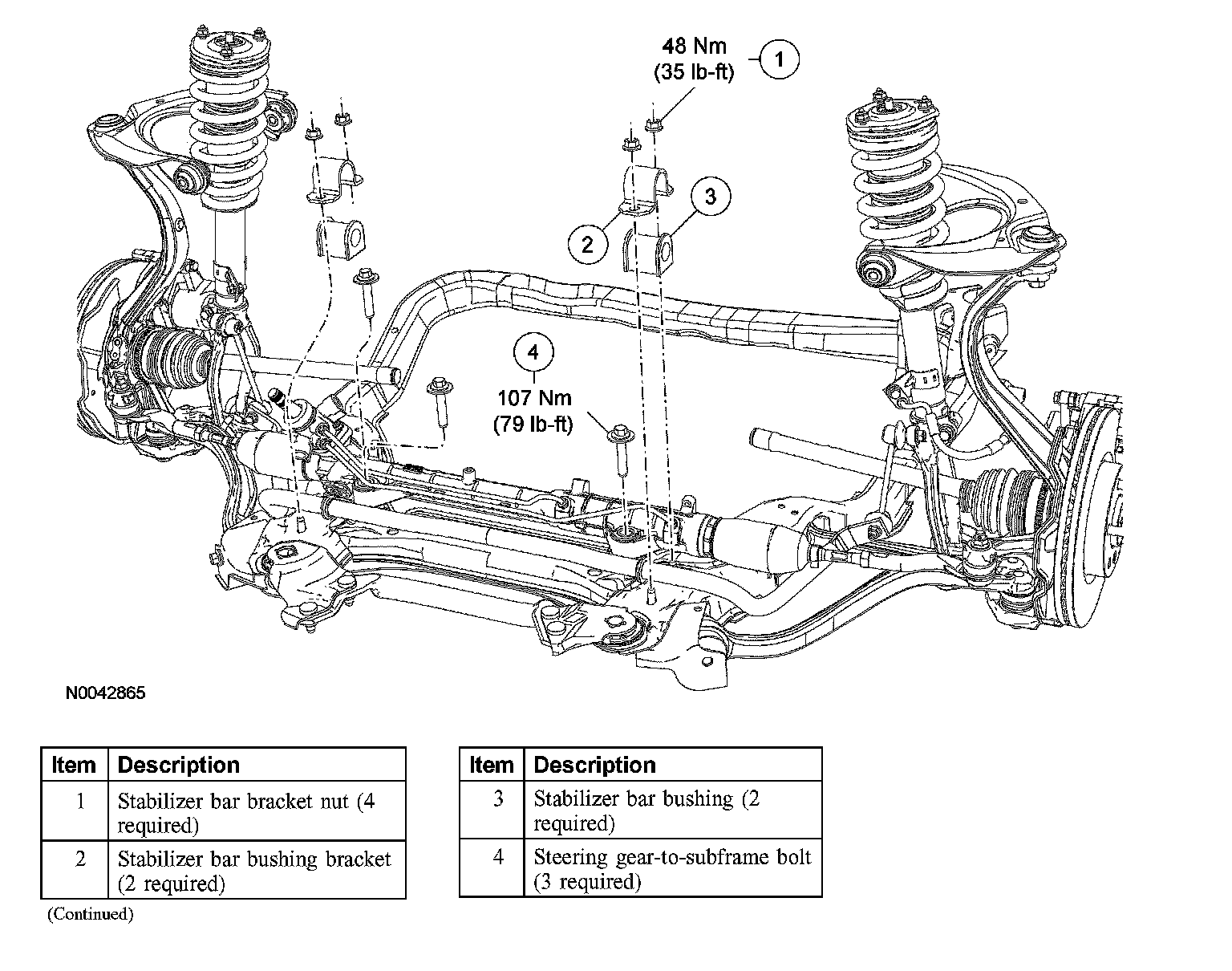^ To install, tighten the bracket nuts to 48 Nm (35 ft. lbs.) with the suspension at the bushing fastener tightening position.