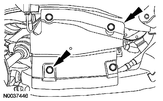 13. Remove the 2 LH steering gear-to-subframe bolts and position the steering gear to access the stabilizer bar LH bracket front nut.