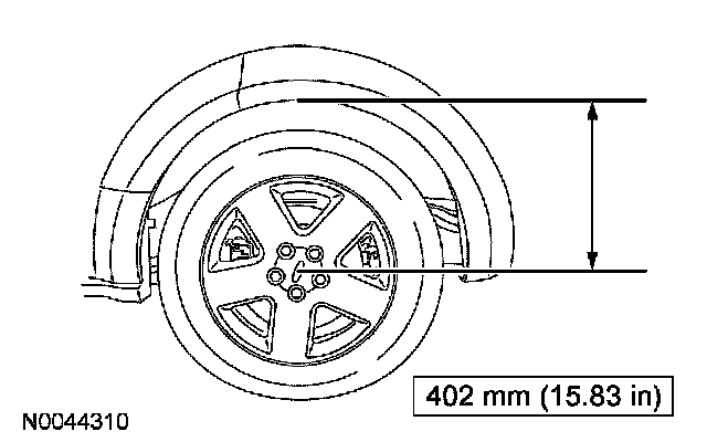 16. CAUTION: Before tightening the stabilizer bar bracket nuts, the suspension must be at the bushing fastener tightening position. Use a suitable jack to raise the suspension until the distance between the center of the hub and the lip of the fender is equal to 402 mm (15.83 inch).