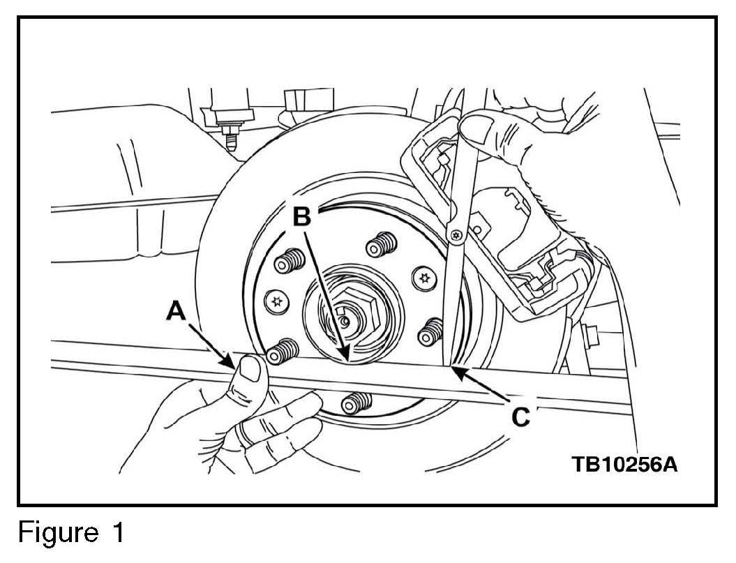 3. Position a straight edge tool (Central Tools CEN6429 or equivalent) flat against the rear brake disc wheel mounting surface, with the side of the straight edge tool next to or touching the wheel hub. (Figure 1A and B)