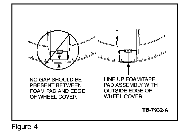 THE EDGE OF THE FOAM/TAPE PAD ASSEMBLY MUST LINE UP WITH THE OUTSIDE EDGE OF THE WHEEL COVER.