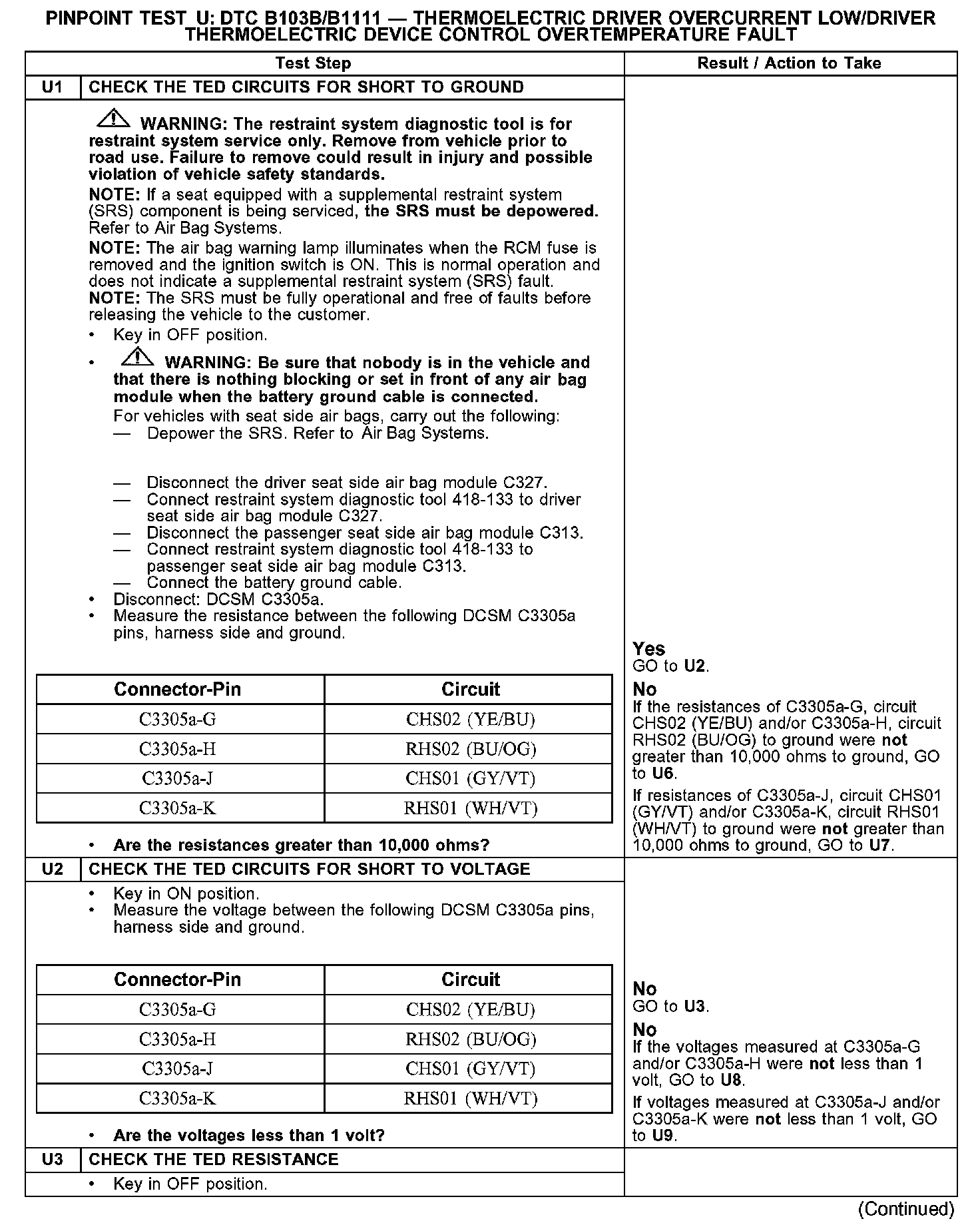 PINPOINT TEST U: DTC B103B/B1111 - THERMOELECTRIC DRIVER OVERCURRENT LOW/DRIVER THERMOELECTRIC DEVICE CONTROL OVERTEMPERATURE FAULTU1-U3:
