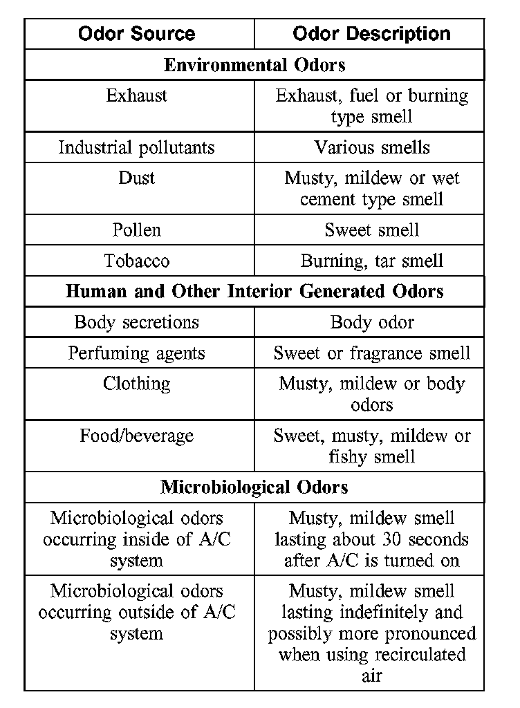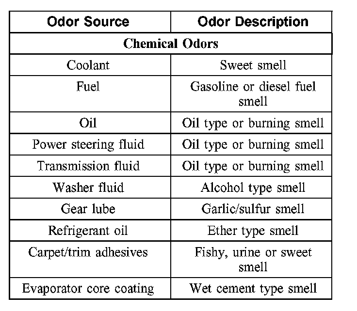 1. Identify the type of odor present in the vehicle. Do not proceed with A/C odor treatment if the odor source is found to be outside of the A/C system. Refer to the chart for examples.