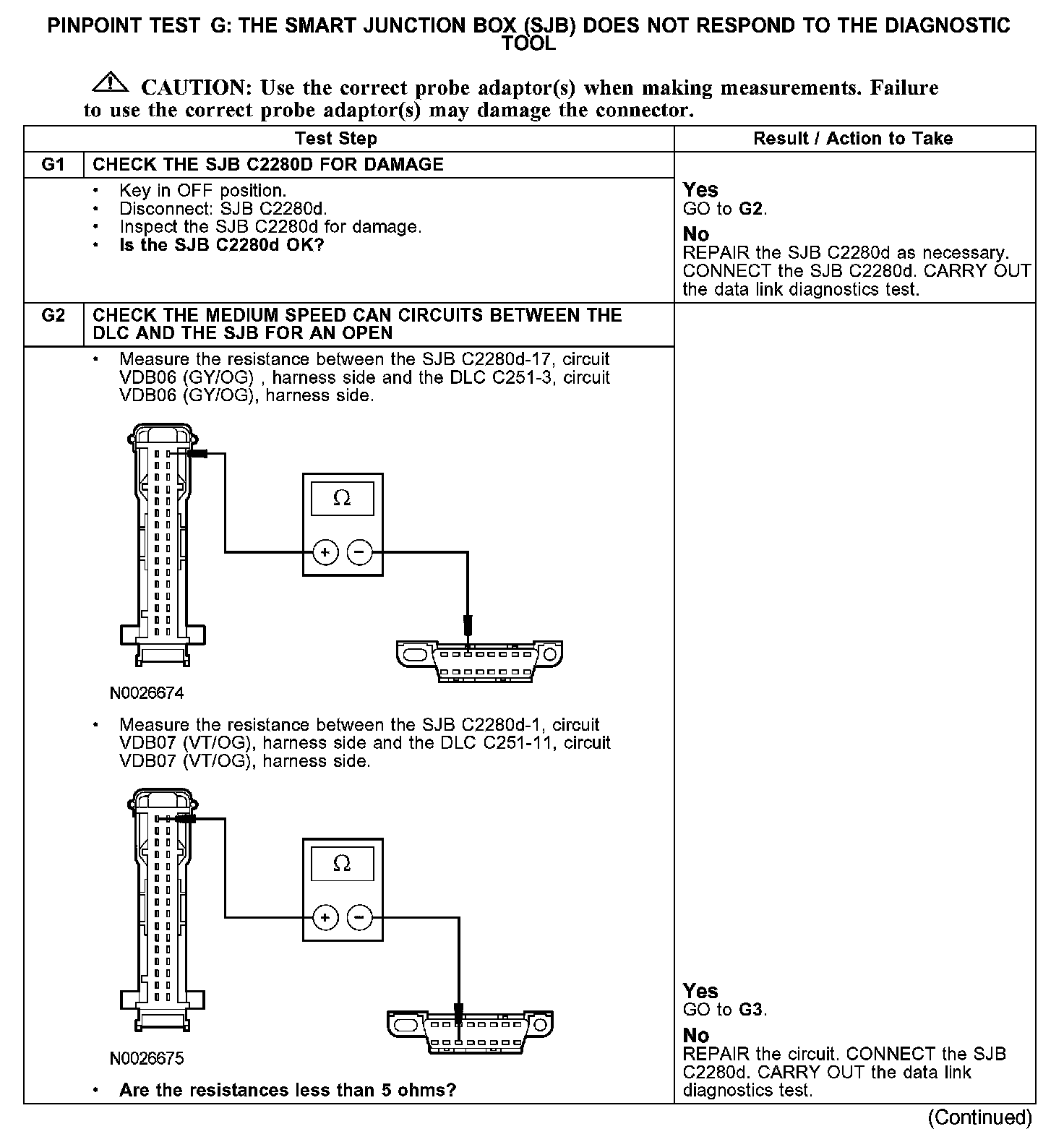 Check the medium speed CAN circuits VDB06 (GY/OG) and VDB07 (VT/OG) between the SJB C2280d and the data link connector (DLC) C251. The total resistance values must not be more than 5 ohms. If the resistance is more than 5 ohms there is an open in one of the high speed CAN circuits, damage to the DLC C251, damage to the SJB C2280d, or a problem in an in-line connector.