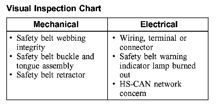 3. If the inspection reveals an obvious concern(s) that can be readily identified, service as required. With the exception of removing a twist from the safety belt webbing, do not attempt to repair a component of the safety belt system; new components must be installed.