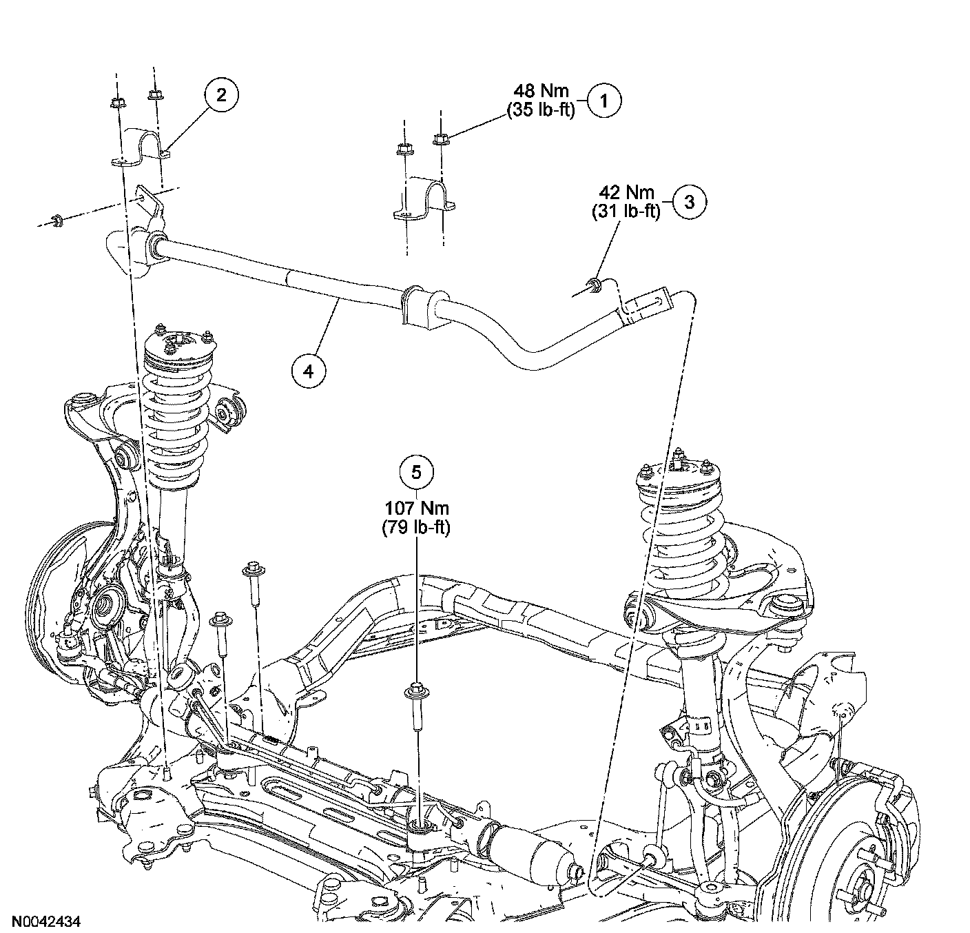 ^ To install, tighten the bracket nuts to 48 Nm (35 ft. lbs.) with the suspension at the bushing fastener tightening position.