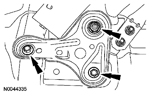 Remove and discard the 4 subframe bracket-to-body bolts, the 2 subframe bracket-to-subframe nuts and lower the rear of the subframe.