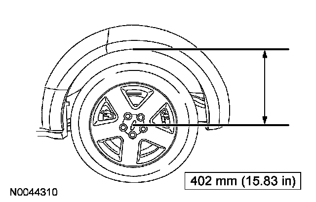 22. CAUTION: Before tightening the stabilizer bar bracket nuts, the suspension must be at the bushing fastener tightening position. Use a suitable jack to raise the suspension until the distance between the center of the hub and the lip of the fender is equal to 402 mm (15.83 inch).