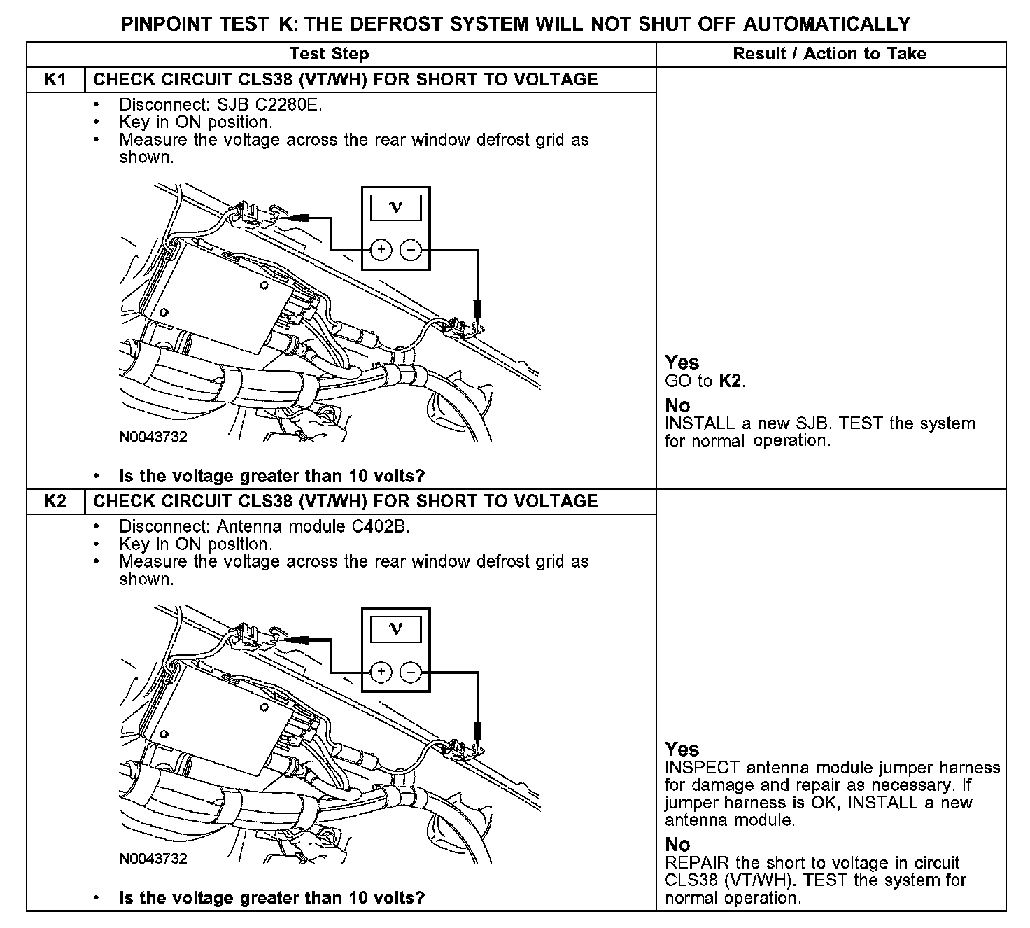 The heated backlight relay, which is integral to the smart junction box (SJB), receives power from circuit SBB06 (BN/RD). When the rear window defrost switch is pressed on the electronic automatic temperature control (EATC) or electronic manual temperature control module (EMTC) control unit, a message is sent to the SJB through circuit CH122 (WH/OG). Once the SJB receives the message to turn on the rear window defrost, the SJB grounds the heated backlight relay coil, which sends power through the antenna module to the rear window defrost grid through circuit CLS38 (VT/WH).