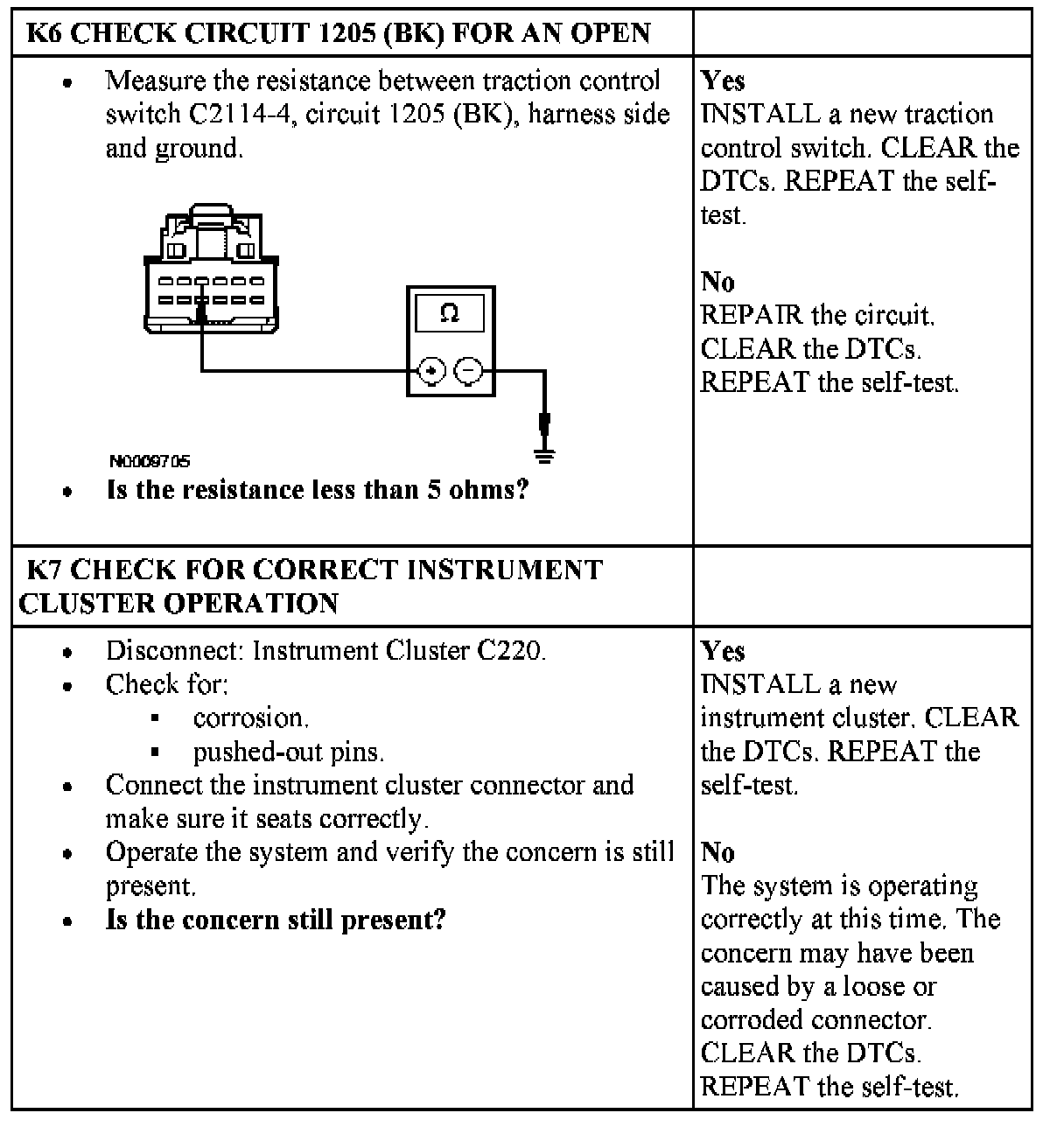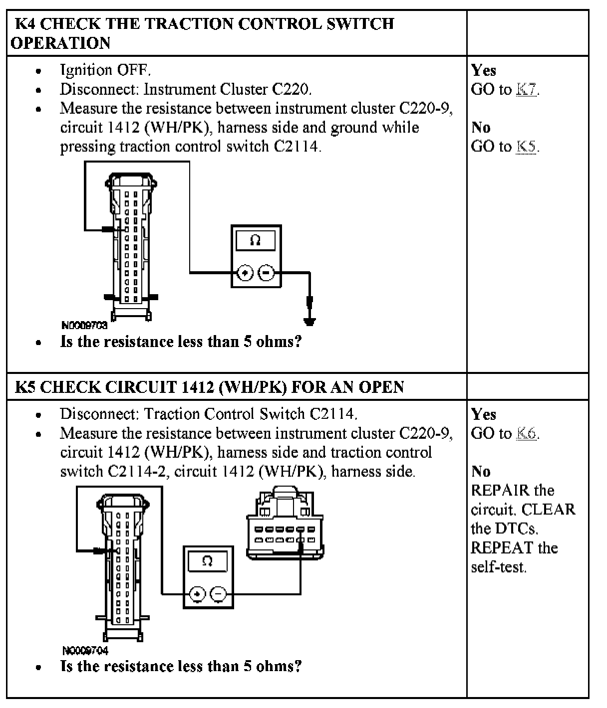 The instrument cluster sends a voltage reference signal to the traction control switch through circuit 1412 (WH/PK). When the traction control switch is pressed, the signal is grounded through circuit 1205 (BK). The instrument cluster then sends a traction control disable command over the controller area network (CAN).