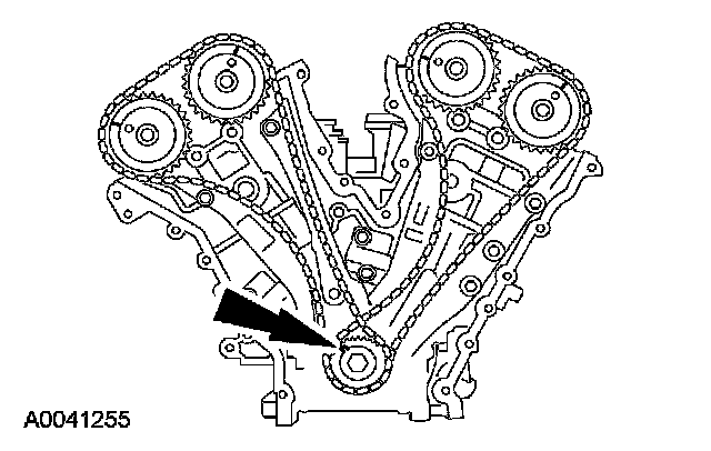 ^ Align the marks on the timing chain with the marks on the camshaft and crankshaft sprockets.