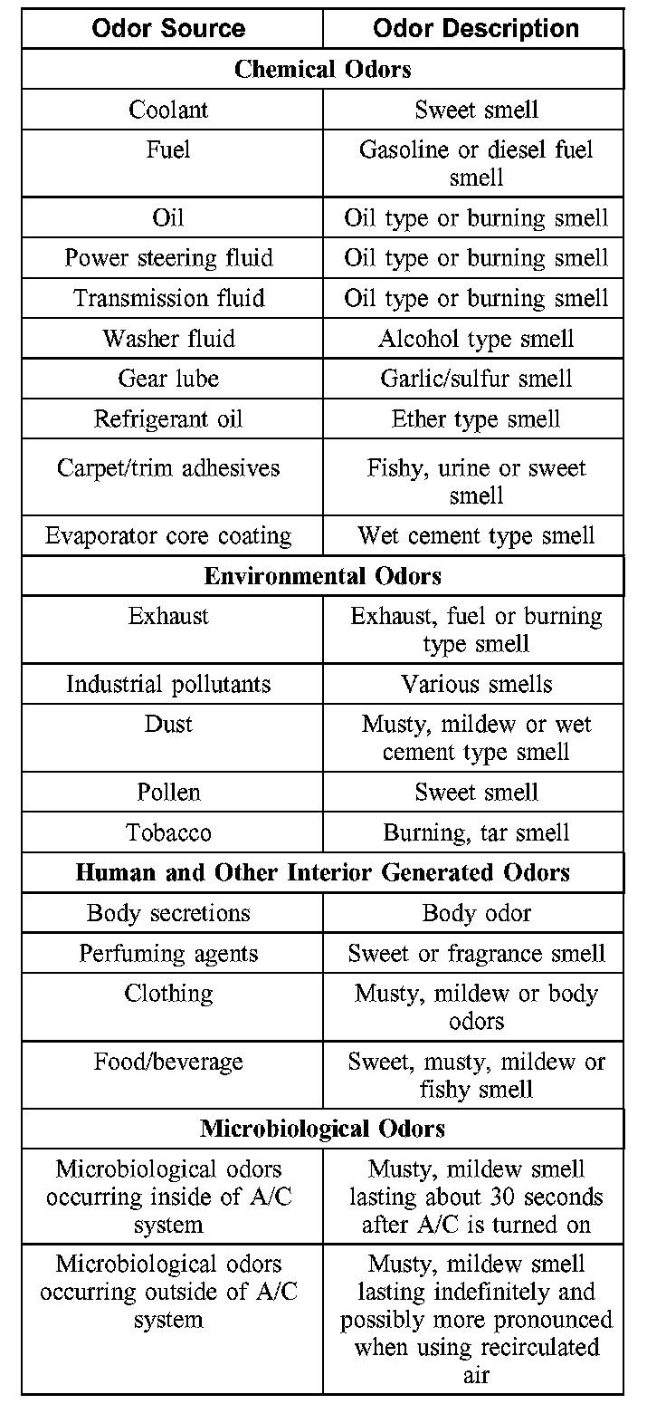 1. Identify the type of odor present in the vehicle. Do not proceed with A/C odor treatment if the odor source is found to be outside of the A/C system. Refer to chart for examples.