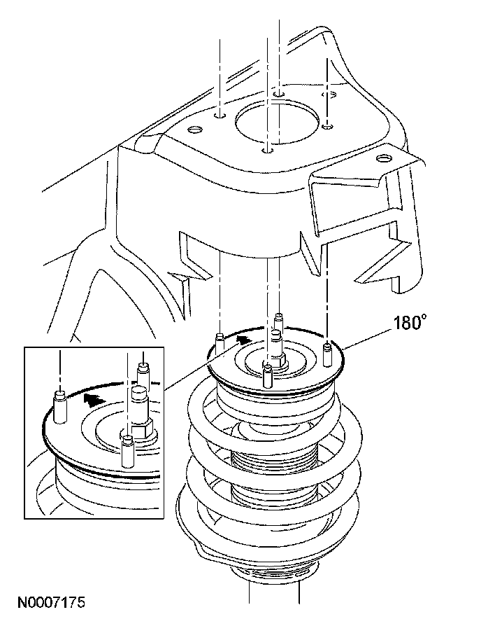 3. CAUTION: Do not rotate the strut mount to any other position than 180° from its original position, the arrow (located on top of the strut mount) must either point to the 3 o'clock or the 9 o'clock position.