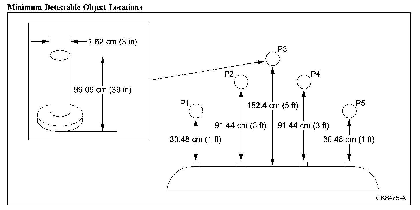 4. Verify that the parking aid module detects the object above when placed in the 5 specified locations (P1, P2, P3, P4 and P5).