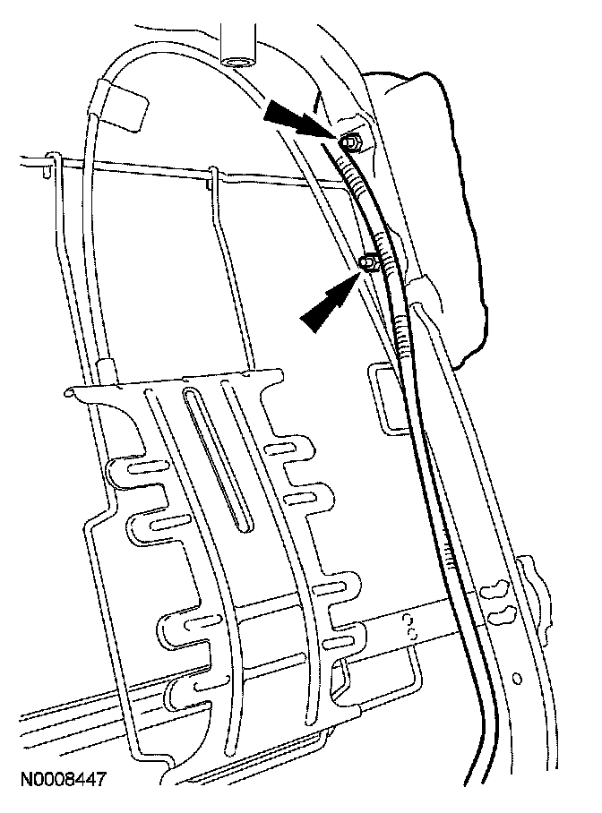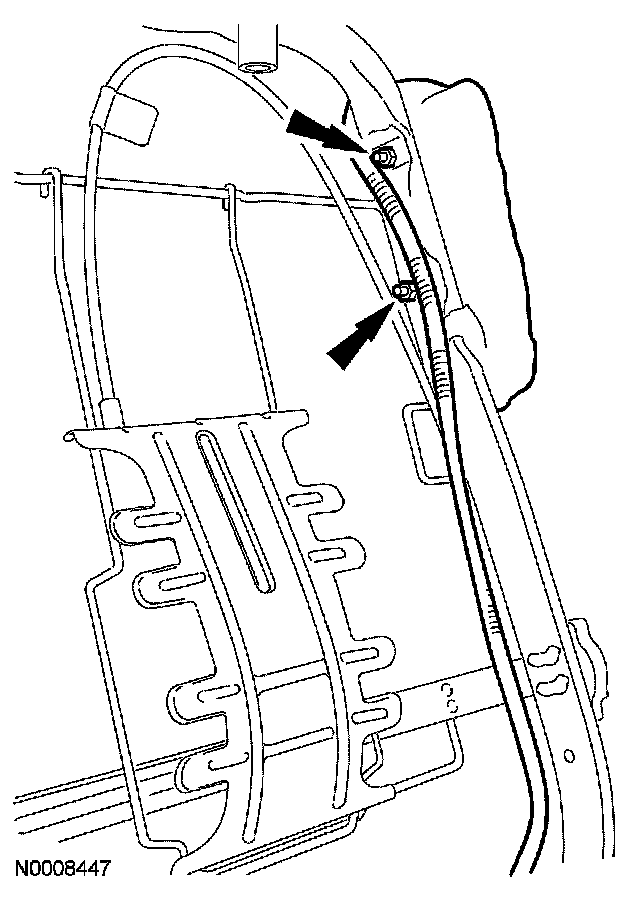 24. Separate the backrest latch cable pin-type retainer at the lower left corner of the backrest frame.