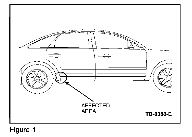 Some 2005-2006 Five Hundred/Montego vehicles driven in certain conditions may exhibit abrasion on the paint finish at the dog leg area of the rear quarter panel. The abrasion results from the lack of moldings and wheel cuffs to prevent small debris in the front tires from striking a limited portion of the lower quarter of the vehicle. In severe cases, the abrasion may result in the removal of the paint finish down to the bare metal at the dog leg area (Figure 1).
